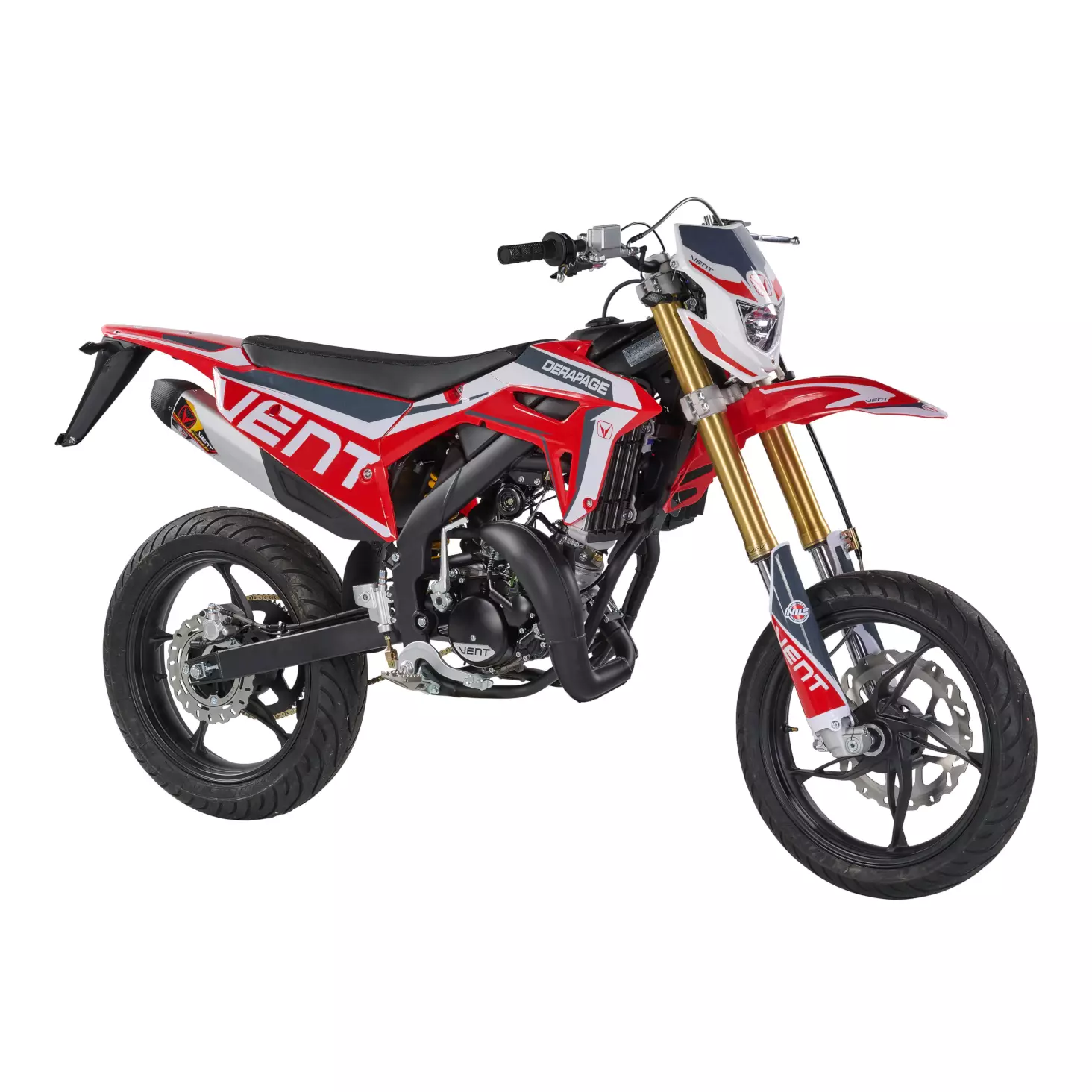 VENT DERAPAGE 50 -supermoton voimanlähteenä toimii tietysti tuttu ja parhaaksi todettu Minarellin 50 cc kaksitahtimoottori, jonka suorituskyky ja huikea suosio eivät vaadi muita perusteluja.